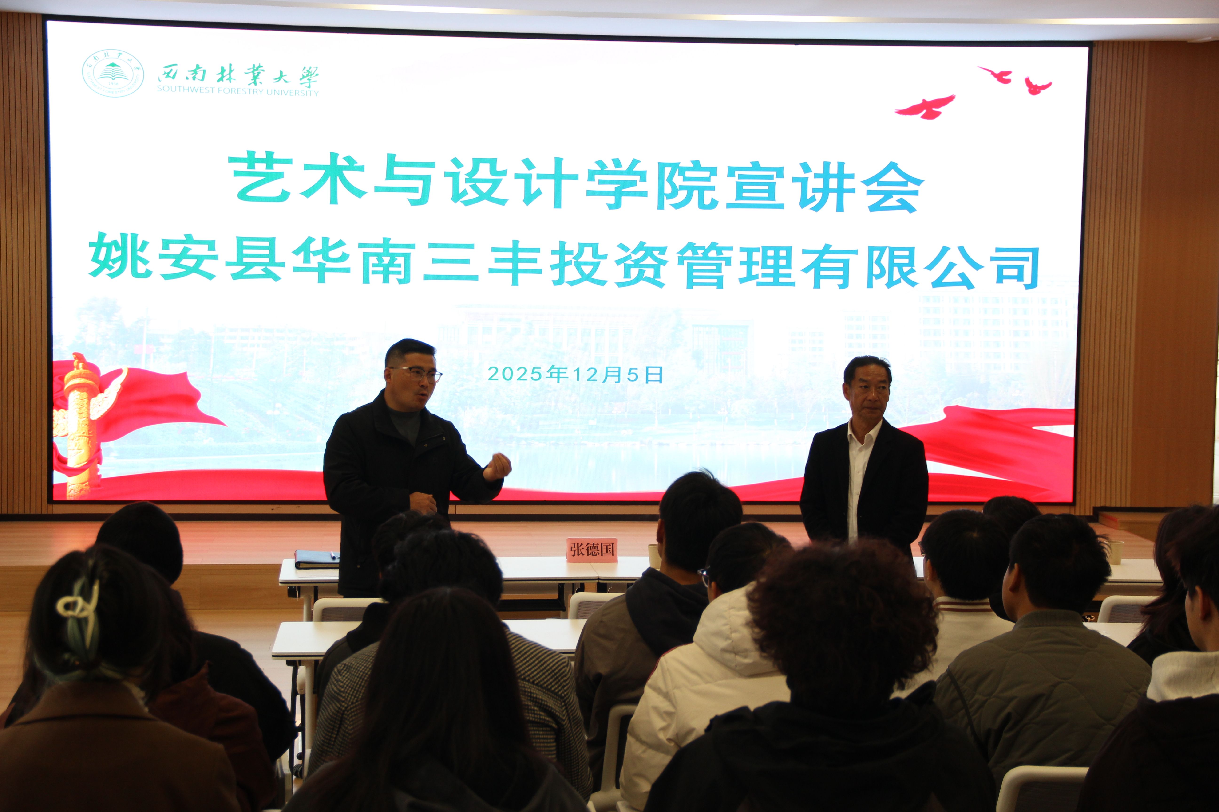 12月5日上午,由太阳成集团tyc522cc主办的姚安县华南三丰投资管理有限公司校园招聘专场宣讲会在设计楼106举行。公司党委书记张德国、党委副书记李浩、公司总经理陈远峰一行及2026届毕业生共80余人参会。宣讲会由李浩主持。