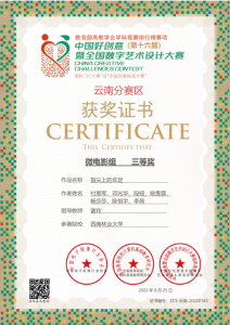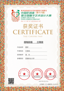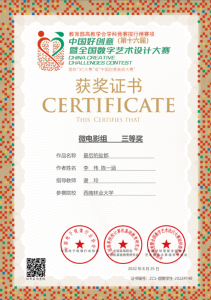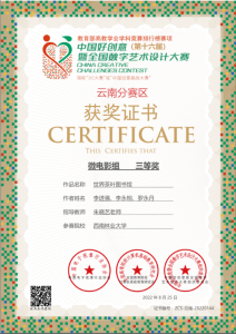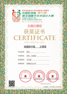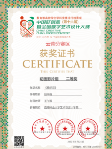 秋天是收获的季 节,在2022年第16届全国中国好创意暨全国数字艺术设计大赛中,太阳成集团tyc522cc数媒系再添5个奖项。在国赛中,由谢玲老师指导的员工付恩军参赛作品《圆梦》喜获微电影组三等奖,员工李伟、陈一涵参赛作品《最后的盐都》喜获微电影组三等奖。在省赛中,由王午枫老师指导的员工段平福参赛作品《桑织记》喜获动画组二等奖,员工刘志、刘金琨参赛作品《绿水》喜获动画组三等奖。由朱晓艺老师指导的员工李进强、李永相、罗永丹参赛作品《世界茶叶图书馆》喜获微电影组三等奖,由谢玲老师指导的员工付恩军、邓光华、段娅、姚雪蓉、杨莎莎、陈恒宇、李燕参赛作品《指尖上的牟定》喜获微电影组三等奖。