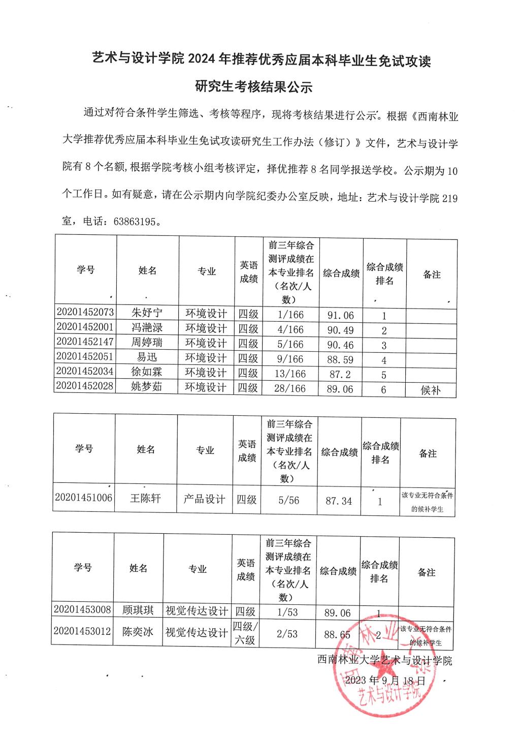 2024年推荐优秀应届本科毕业生免试攻读研究生考核结果公示