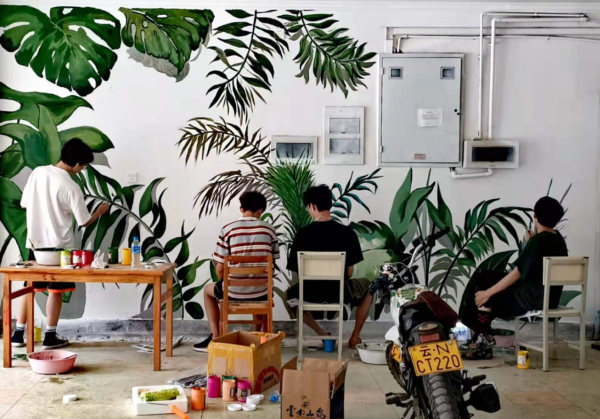 该壁画以云南热带雨林中的植物为主题,既契合了当代老员工心理健康主旨的要求,又营造了宁静、康乐的建筑内环境,符合林业院校的特质。美术系师生通过巧妙细致地构思,在位于建筑内不同部分的五个墙面上,仔细认真地描绘,一丝不苟地设色,构建了一个温暖、和谐、健康的校园文化氛围。
